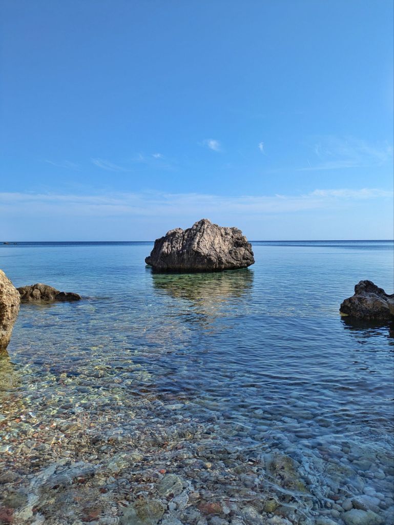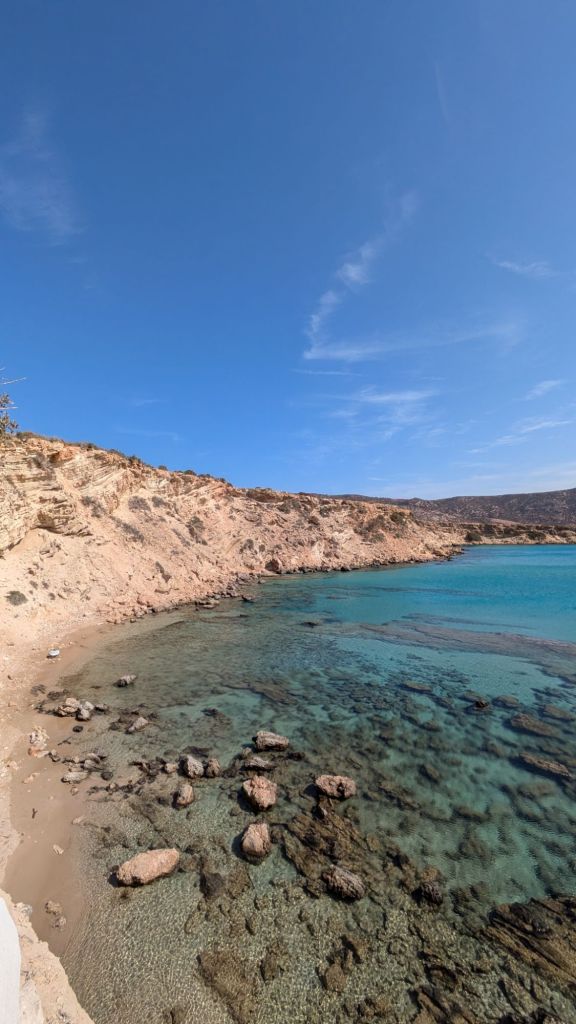 Amoopi è particolarmente speciale per la varietà che offre. La baia di Amoopi comprende in realtà diverse spiagge, tutte con sabbia dorata e ciottoli levigati dal mare, bagnate da acque cristalline che vanno dal turchese al blu intenso. Tra queste, le spiagge principali sono Grande Amoopi (Megali Amoopi) e Piccola Amoopi (Mikri Amoopi), ognuna con un fascino e un’atmosfera unica.