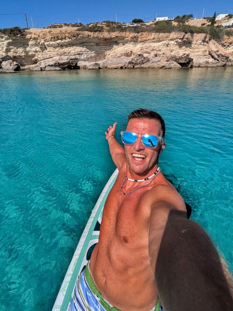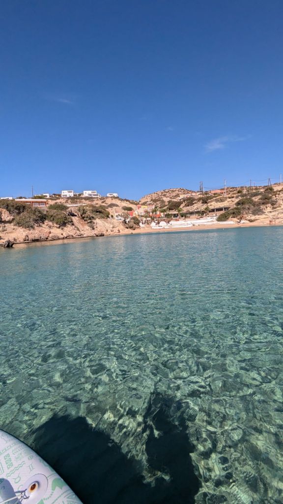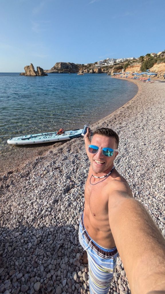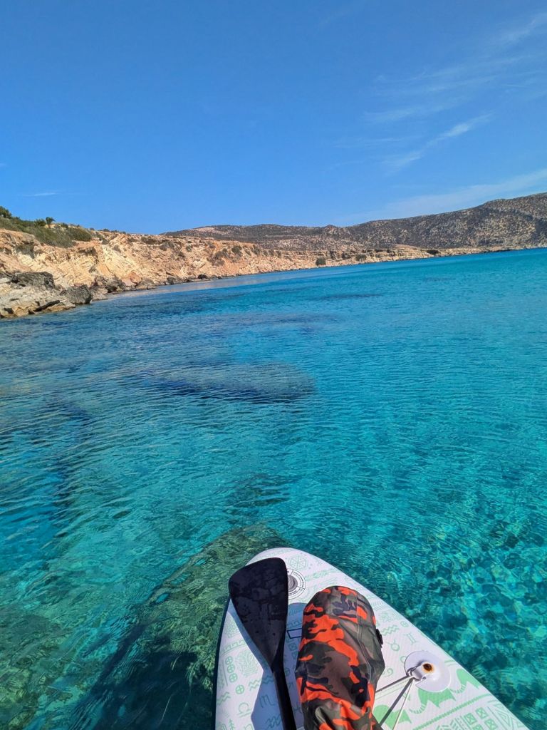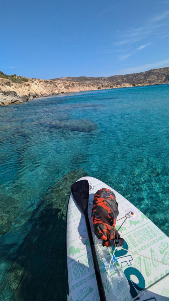 - Acque Cristalline e Fondali di Ciottoli: Le acque di Votsalakia sono incredibilmente trasparenti, e i ciottoli bianchi sul fondale rendono l’acqua ancora più chiara e luminosa. Con il SUP, si può pagaiare sopra questi fondali e osservare i giochi di luce creati dai ciottoli sottostanti.